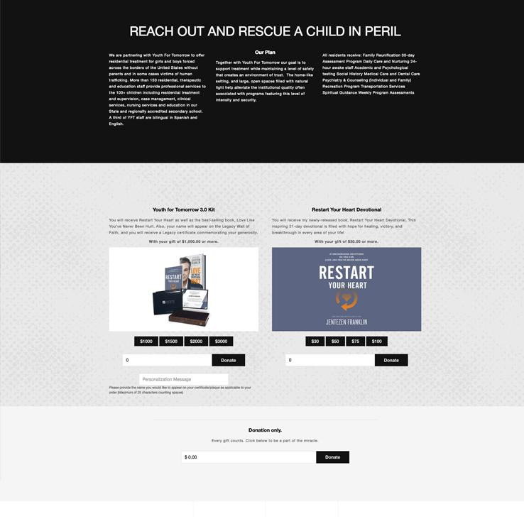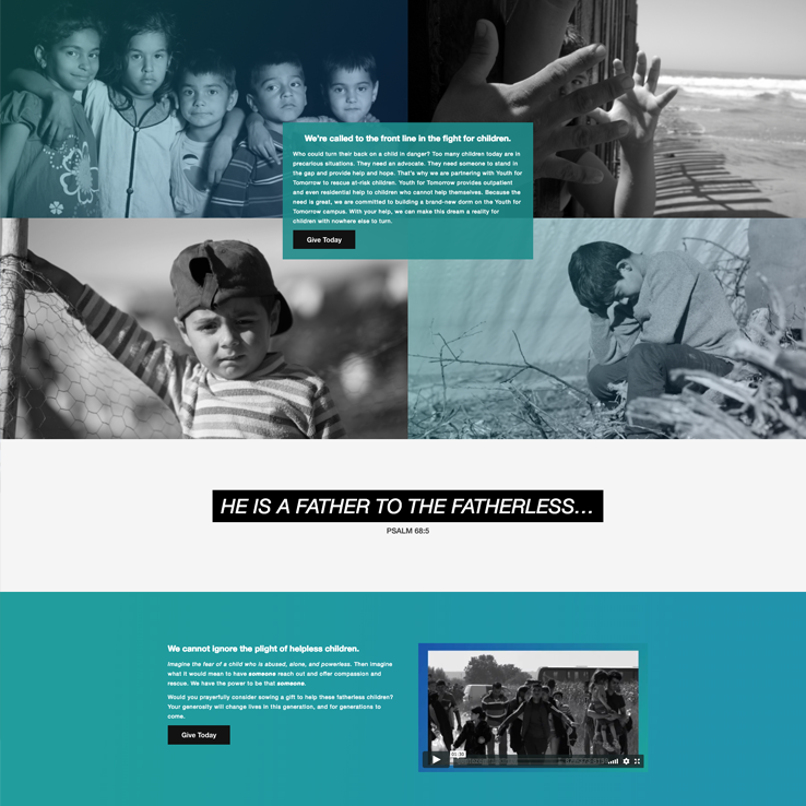 Youth for Tomorrow is a nationally recognized non-profit. We launched a single-page website to promote and engage users in their current building campaign by highlighting areas of need and sharing the story.